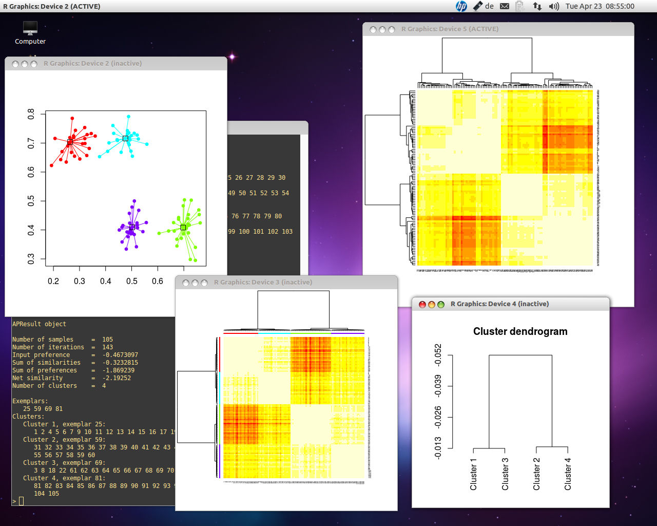 The package further implements leveraged affinity propagation, exemplar-based agglomerative clustering, and various tools for visual analysis of clustering results.