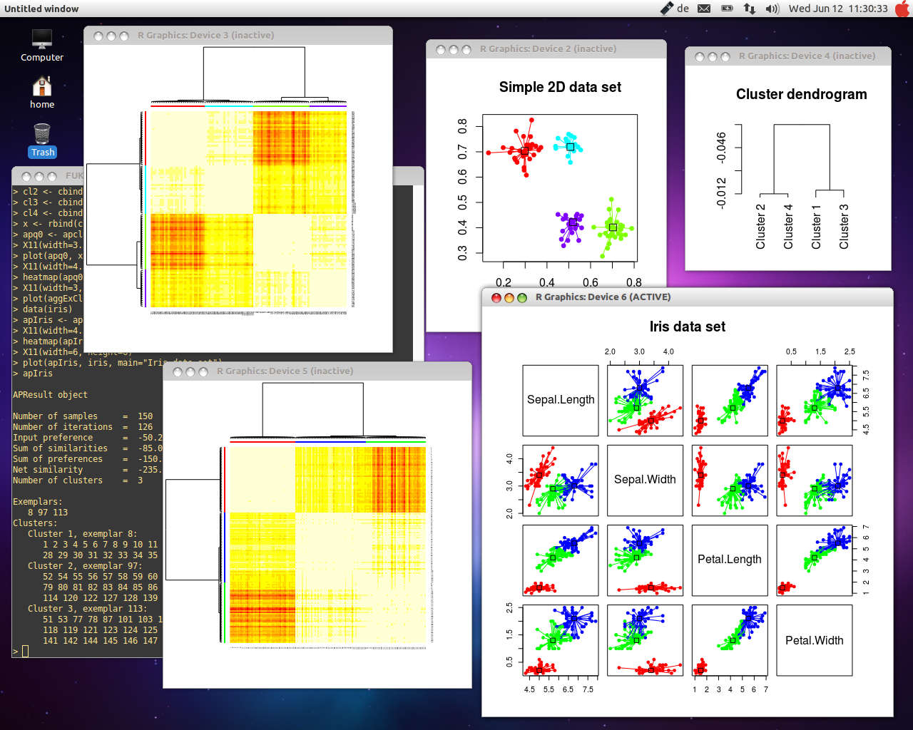 The package further implements leveraged affinity propagation, exemplar-based agglomerative clustering, and various tools for visual analysis of clustering results.