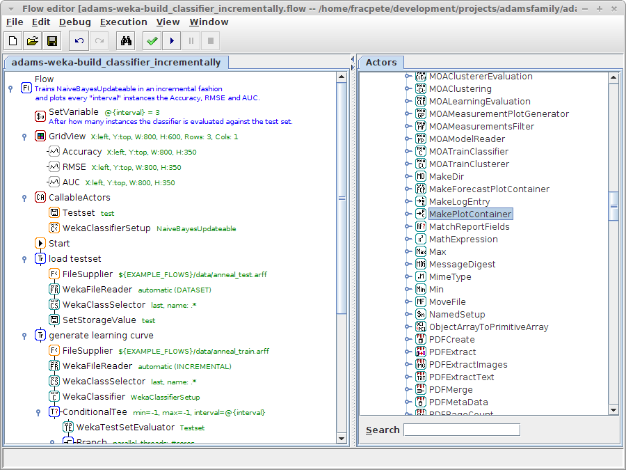 The Advanced Data mining and Machine learning System, or short ADAMS, is a novel, flexible workflow engine aimed at quickly building and maintaining real-world, complex knowledge workflows. Instead of placing operators on a canvas and manually connecting them, a tree structure and flow control operators determine how the data is being processed, e.g., sequentially or in parallel. This approach allows the rapid development and easy maintenance of large workflows, consisting of hundreds or even thousands of operators. ADAMS offers operators for machine learning libraries like WEKA and MOA and image processing libraries such as ImageJ, Java Advanced Imaging (JAI), ImageMagick and Gnuplot. Via Rserve, the R-Project can be incorporated in flows for data processing. With the WEKA webservice, other frameworks can take advantage of WEKA's models as well. For fast prototyping the user can use scripting languages such as Groovy and Jython. GIS support is possible with the OpenStreetMap integration.