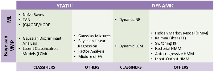 Static models: Naive Bayes, TAN, AODE, Gaussian Discriminant Analysis, Latent Classification Models, Gaussian Mixtures, Bayesian Linear Regression, Factor analysis, Mixture of Factor Analysis, ...