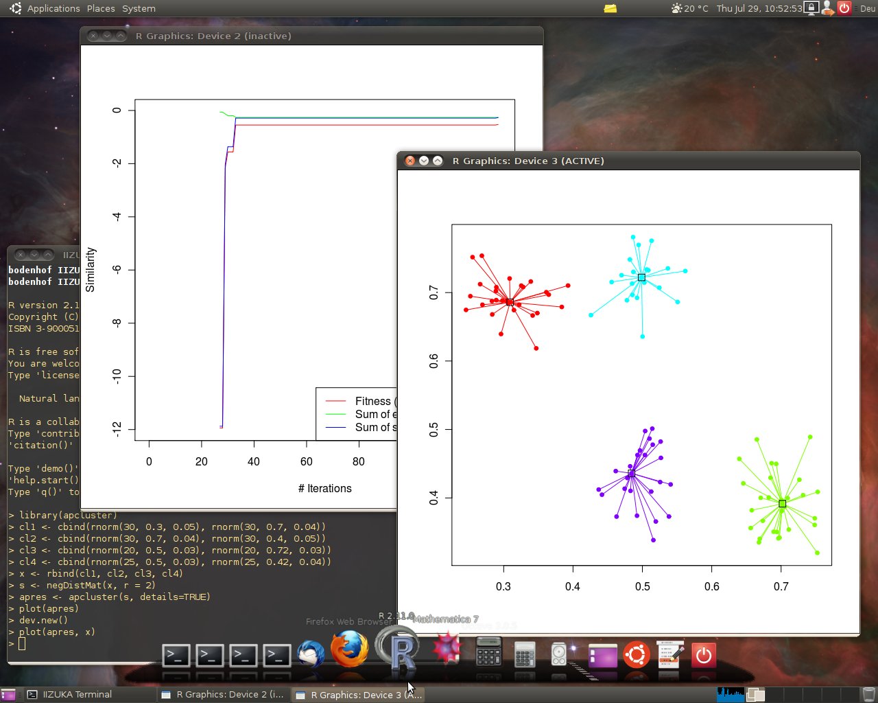 AP has been applied in various fields recently, among which bioinformatics is becoming increasingly important. Frey and Dueck have made their algorithm available as Matlab code. Matlab, however, is relatively uncommon in bioinformatics. Instead, the statistical computing platform R has become a widely accepted standard in this field. In order to leverage affinity propagation for bioinformatics applications, we have implemented affinity propagation as an R package. Note, however, that the given package is in no way restricted to bioinformatics applications. It is as generally applicable as Frey’s and Dueck’s original Matlab code.