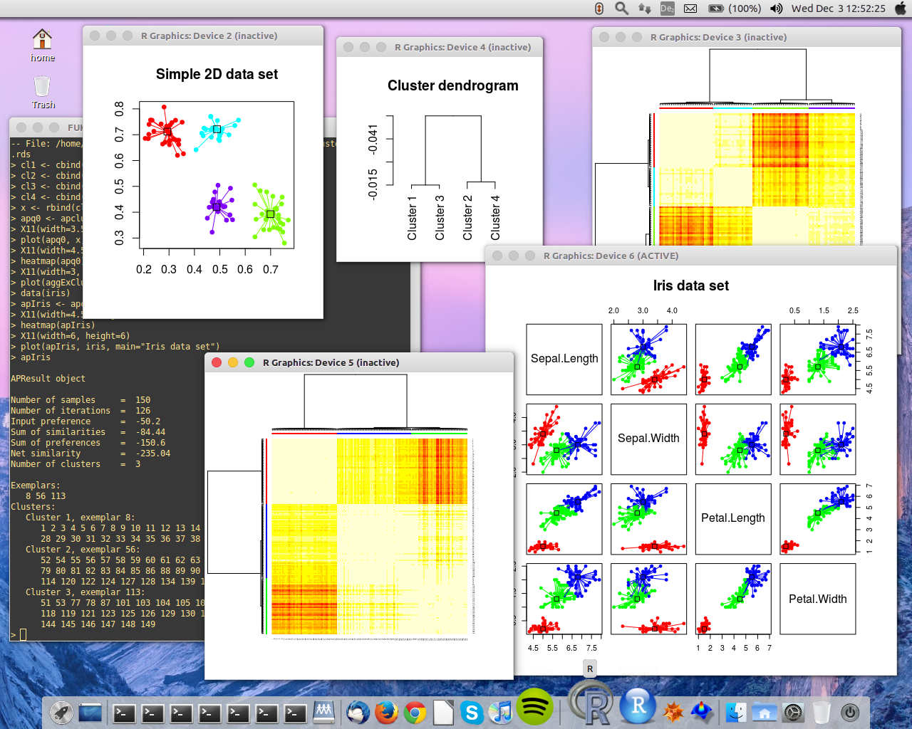 About: The apcluster package implements Frey's and Dueck's Affinity Propagation clustering in R. The package further provides leveraged affinity propagation, exemplar-based agglomerative clustering, and various tools for visual analysis of clustering results. Changes: